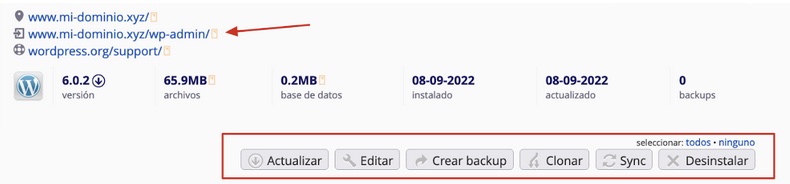 Una vez que el servidor termine de procesar los archivos visualizamos la instancia de nuestra aplicación y disponemos de varias opciones como actualizar, editar, crear un backup, clonar, sincronizar los archivos, desinstalar e incluso podemos acceder directamente a nuestro gestor de contenido haciendo clic en el enlace: